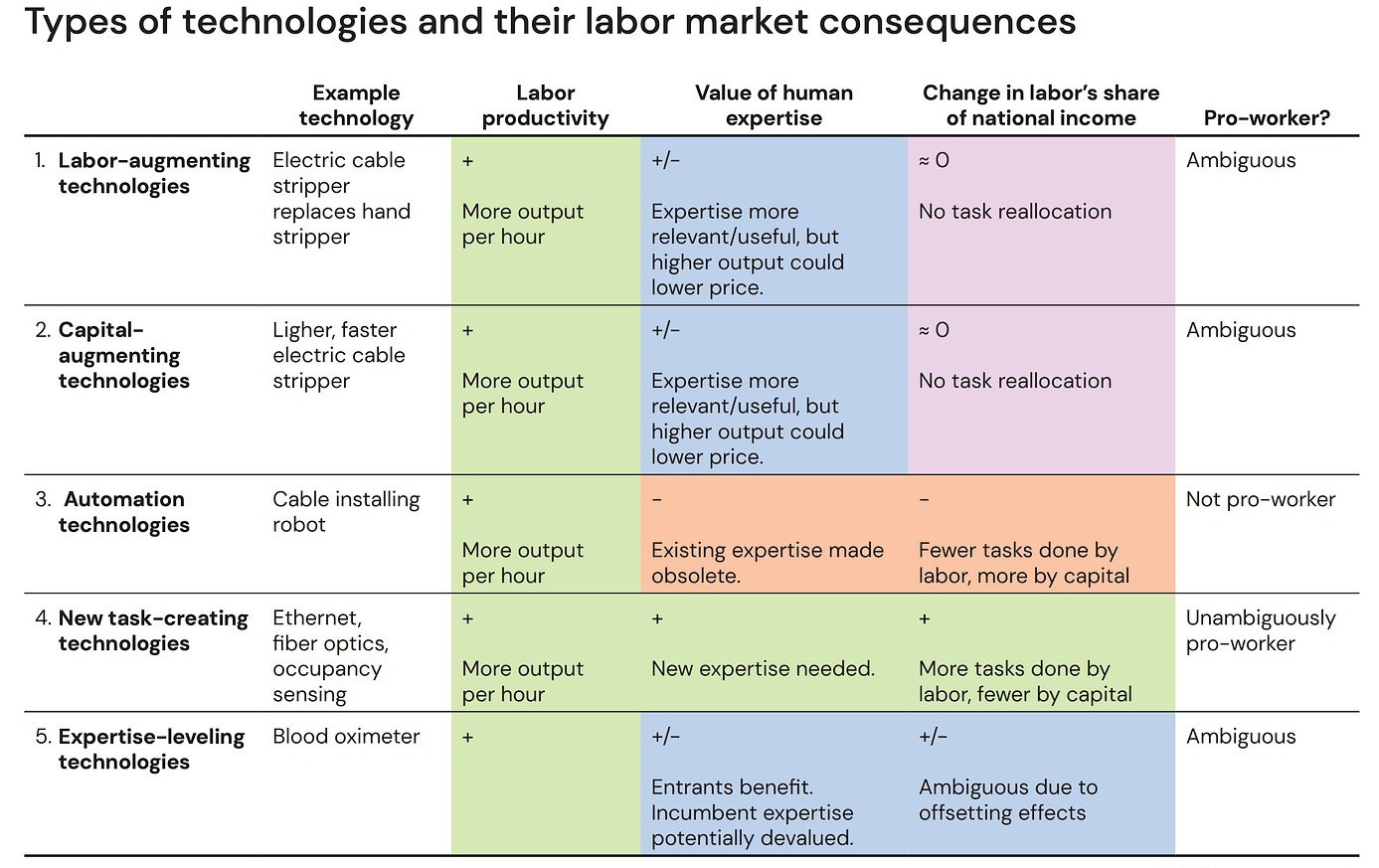 The Brookings paper defines categories of technological change brought by AI. Labor and capital-augmenting technologies make workers or machines faster at what they already do. Automation technologies replace tasks humans used to do. Expertise-leveling technologies let less experienced workers perform tasks that used to require deeper training, like Claude Code or Codex. All of these raise productivity, but none of them guarantee that workers end up better off. And none of them address what actually makes people effective at work.